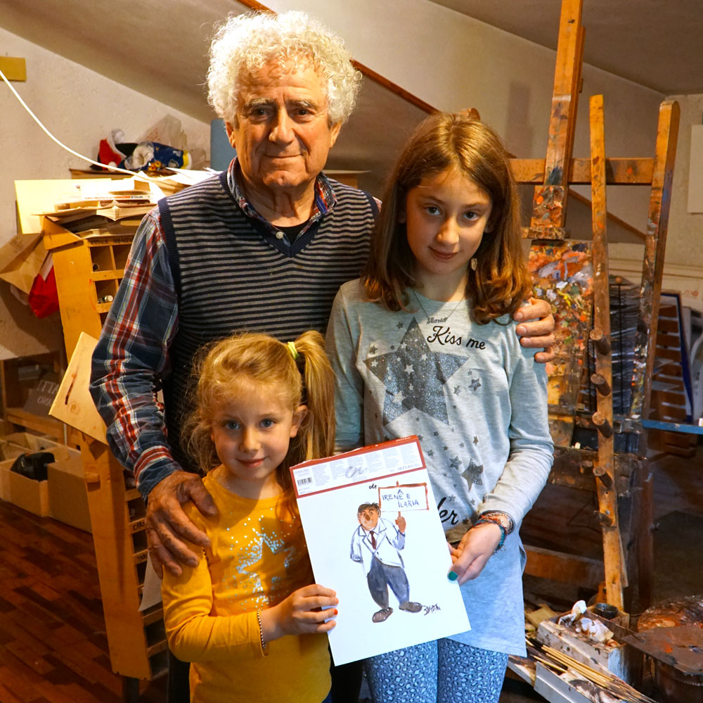 Ilaria e Irene girano curiose tra pile di libri impolverati, bidoncini colmi di pennelli consumati e tavolozze dai mille colori fino a quando le chiama vicino e crea insieme a loro un simpatico quadretto che hanno appeso orgogliose nella loro cameretta.